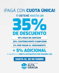 La Dirección de Ingresos Públicos del Gobierno de Alta Gracia informa que hasta el próximo 20 de enero se encuentra habilitado el pago de tasas municipales con la modalidad cuota única, que permite a los contribuyentes acceder a descuentos de hasta el 35%.