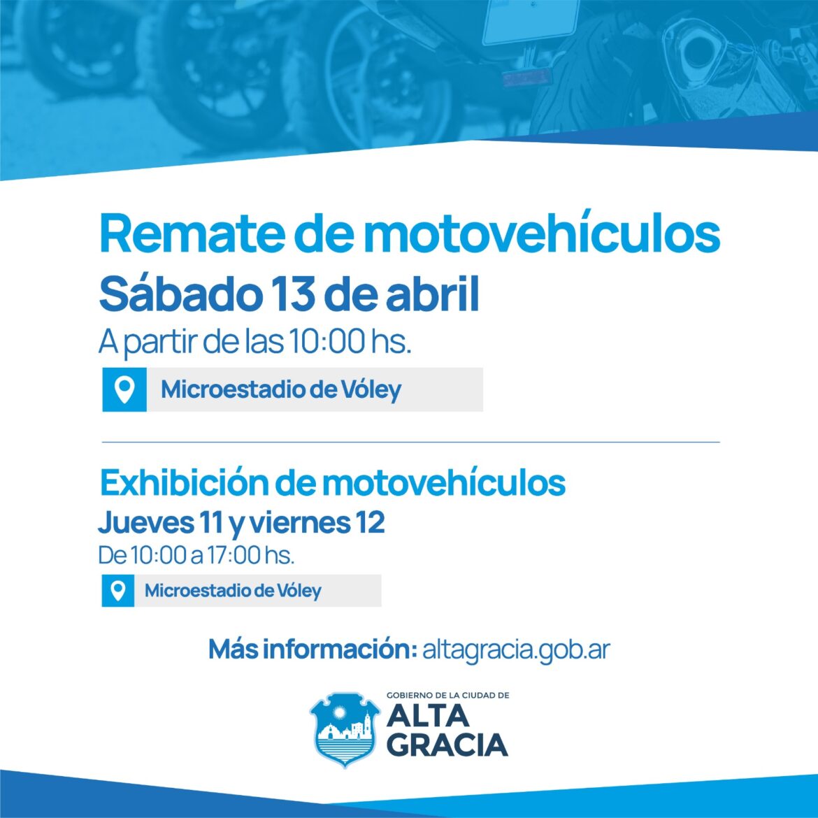 El Gobierno de Alta Gracia informa a través de la Subsecretaría General y de Recursos Humanos, dependiente de la Secretaría de Gobierno; que los días jueves 11 y viernes 12 de abril, de 10 a 17hs, se encontrarán en exhibición los motovehículos que serán subastados en el próximo remate de motos a realizarse el sábado 13 de abril a las 10 hs. Tanto la exhibición como el remate tendrán lugar en el Microestadio Municipal de Vóley, sito en José Hernández esquina Agustín Aguirre.